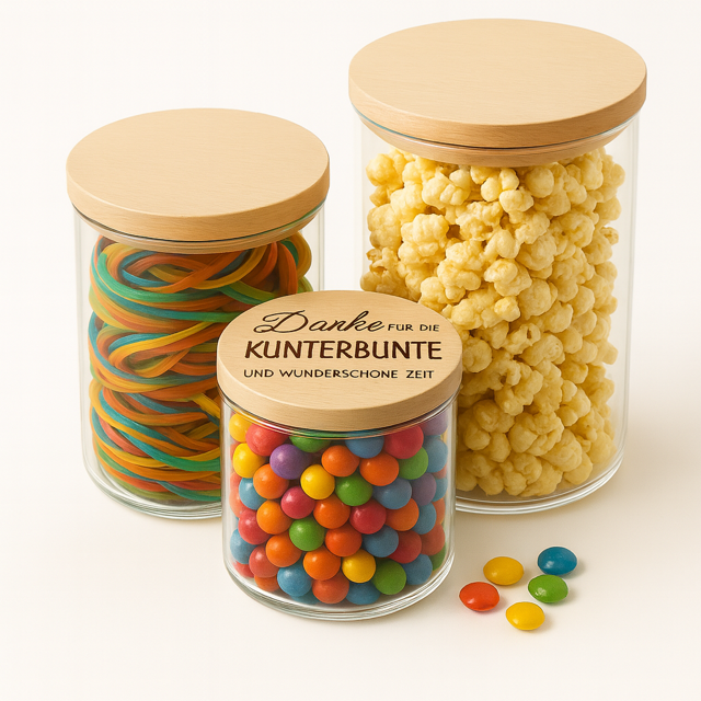 Unsere Gläser zum Befüllen bieten Platz für süße Überraschungen, kleine Grüße oder persönliche Mischungen – ihr entscheidet, womit ihr sie füllt. Wir liefern das schöne Gefäß, ihr die Idee.